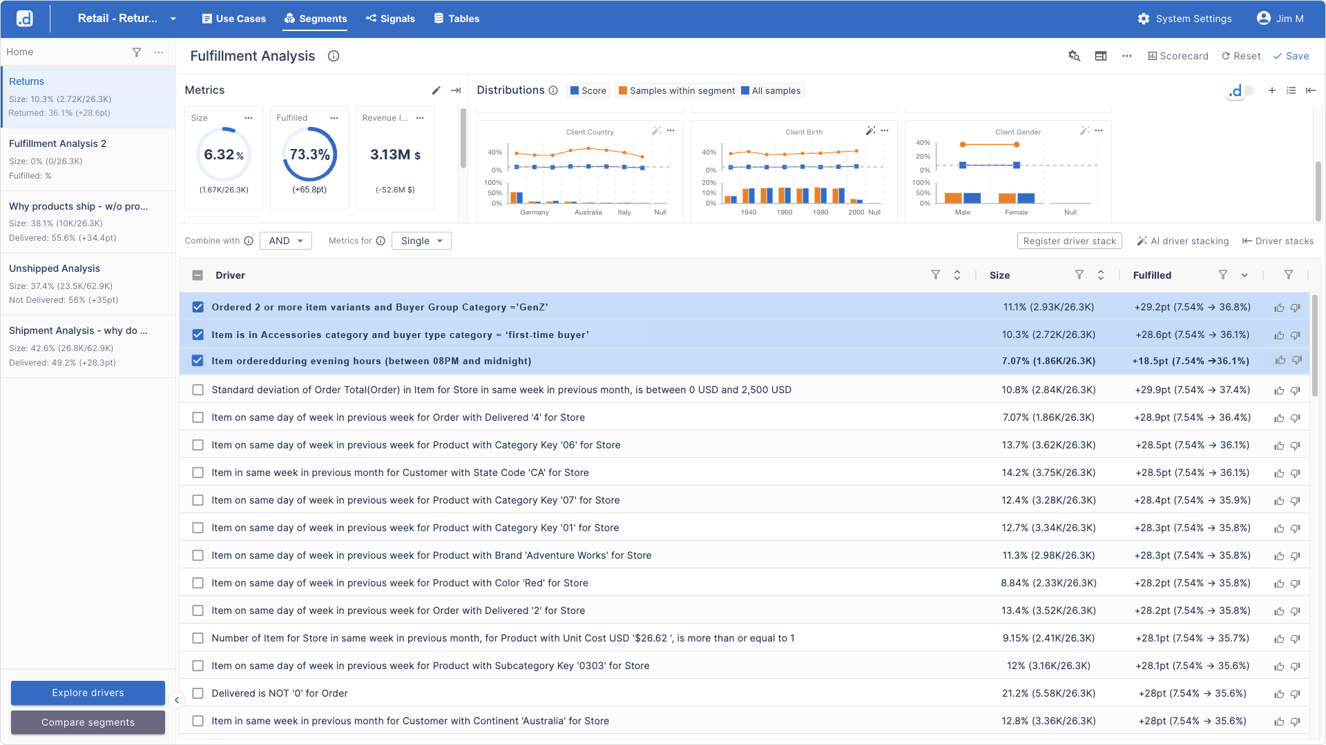 Using Driver Stacking—a feature allowing the manager to layer multiple business drivers together—she discovers that combining three drivers creates a hyper-specific micro-segment: